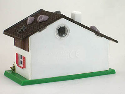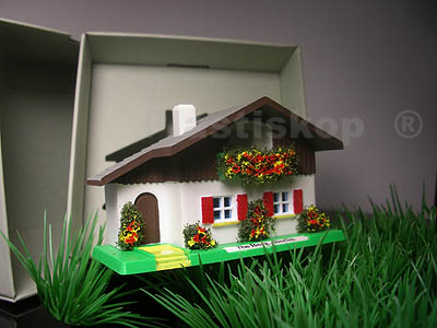Innenbilder: 8 Maße: 80 x 50 x 35 mm Farben: handbemalt und handdekoriert Frontbild: keines Textschild: optional (in der Grundplatte) Bedruckung: optional (z.B. auf den Rückseite) Besonderheit: Der Schornstein ist der Schalter für den Bildtransport